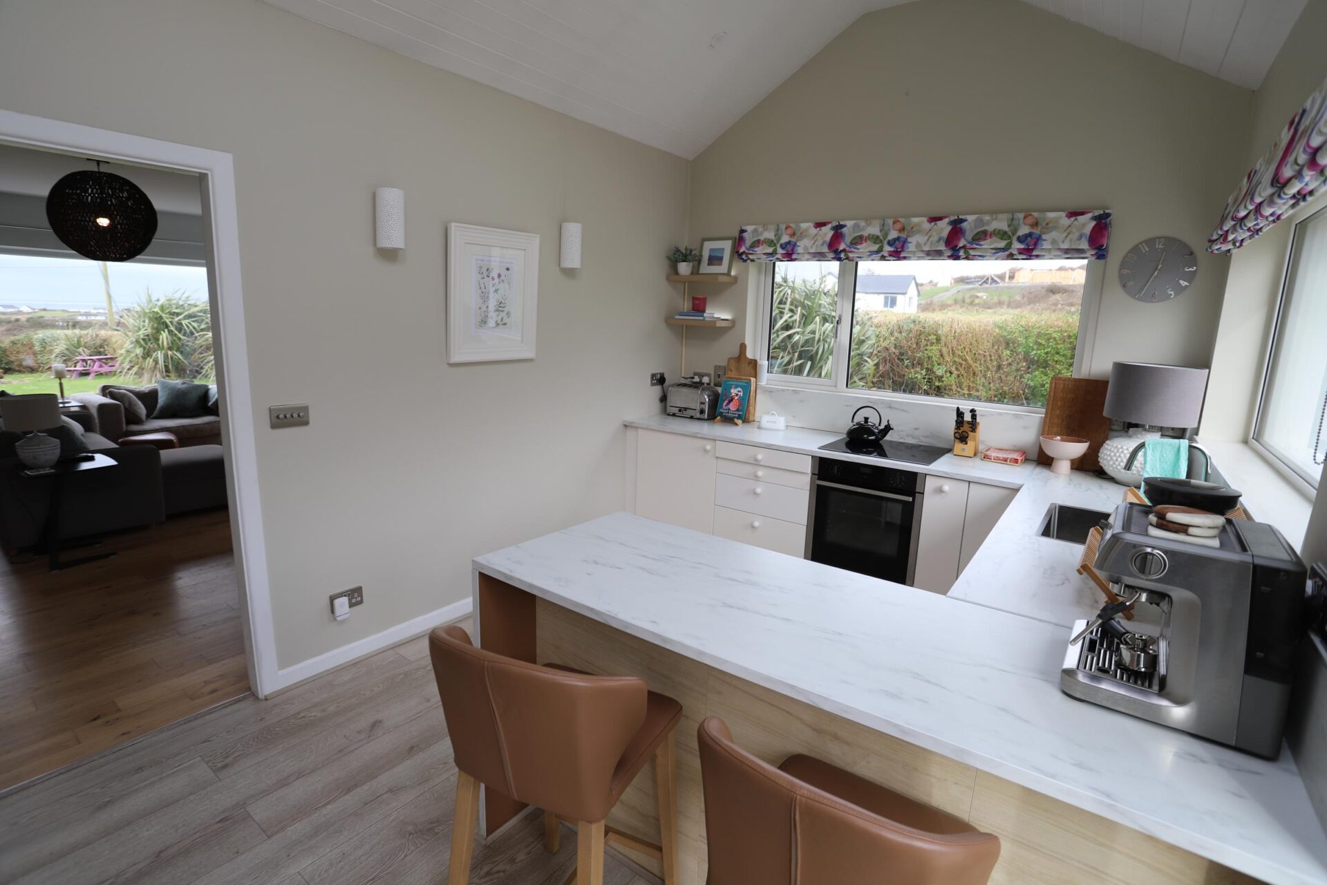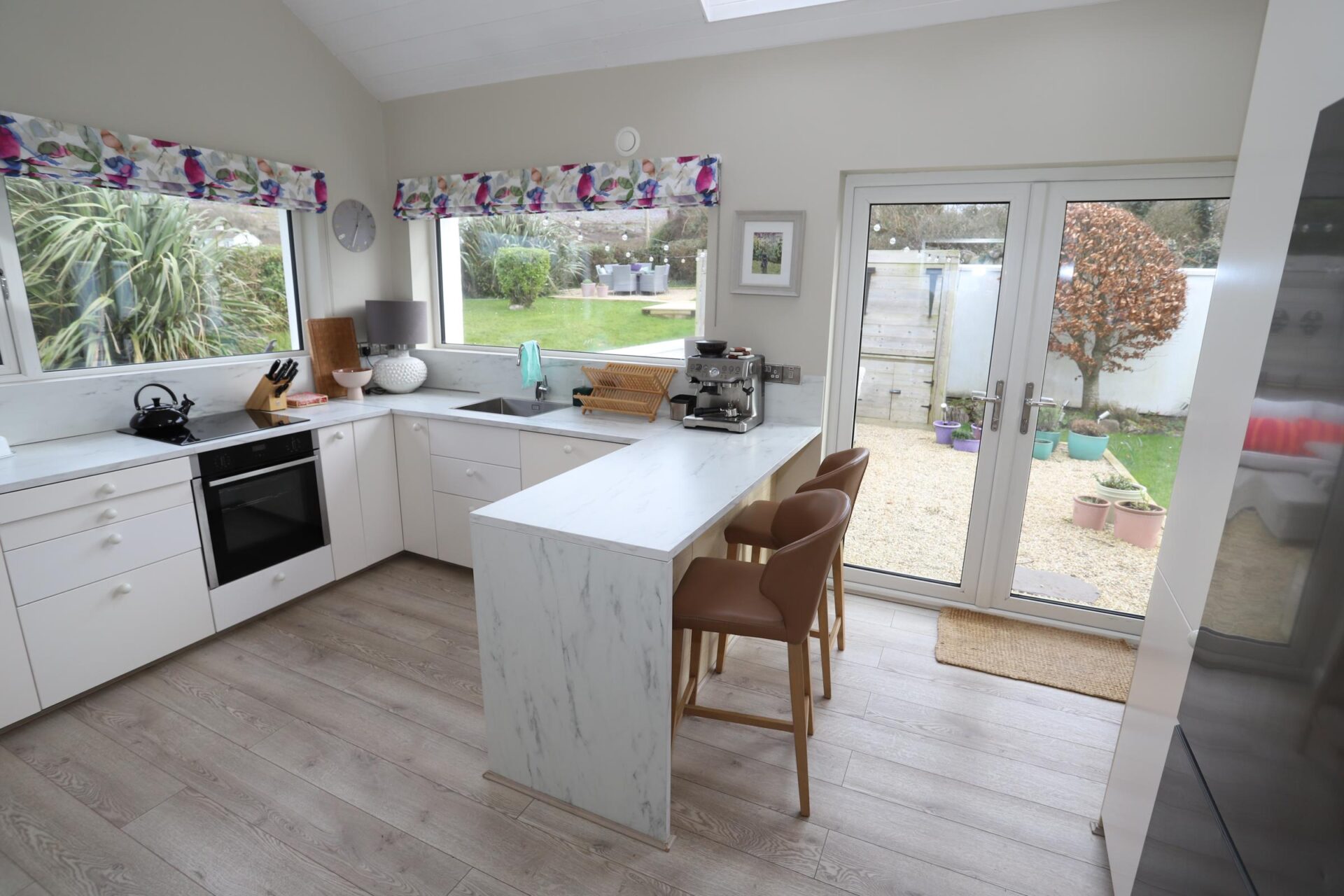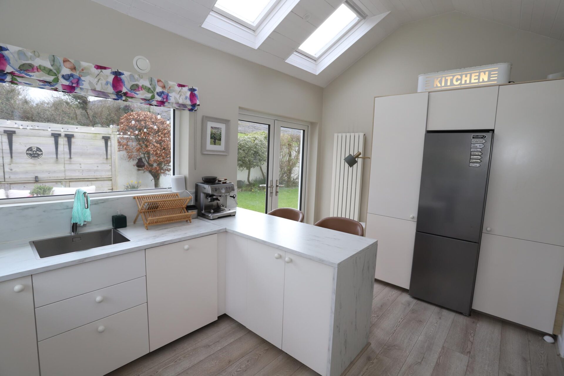 Kitchen 4.6m x 3.3m (15'1" x 10'10") • Wooden Flooring • White fitted kitchen with breakfast bar • Electric oven & Hob • Vaulted ceiling with Velux Windows • Splashback • French doors leading outside seating area
