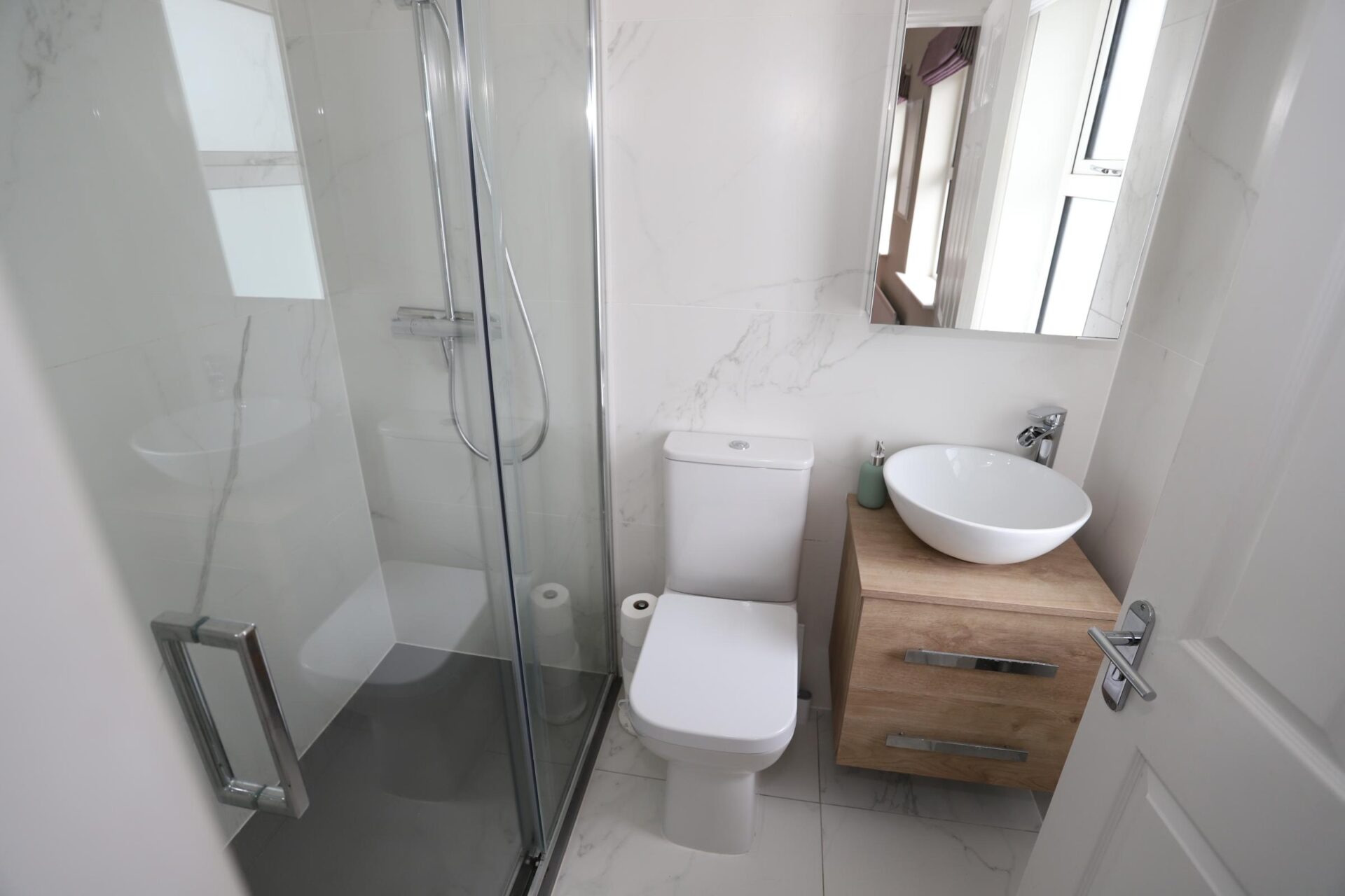 Ensuite Bathroom 1.6m x 2m (5'3" x 6'7") • WC • WHB with vanity • Shower • Tiled floor to ceiling